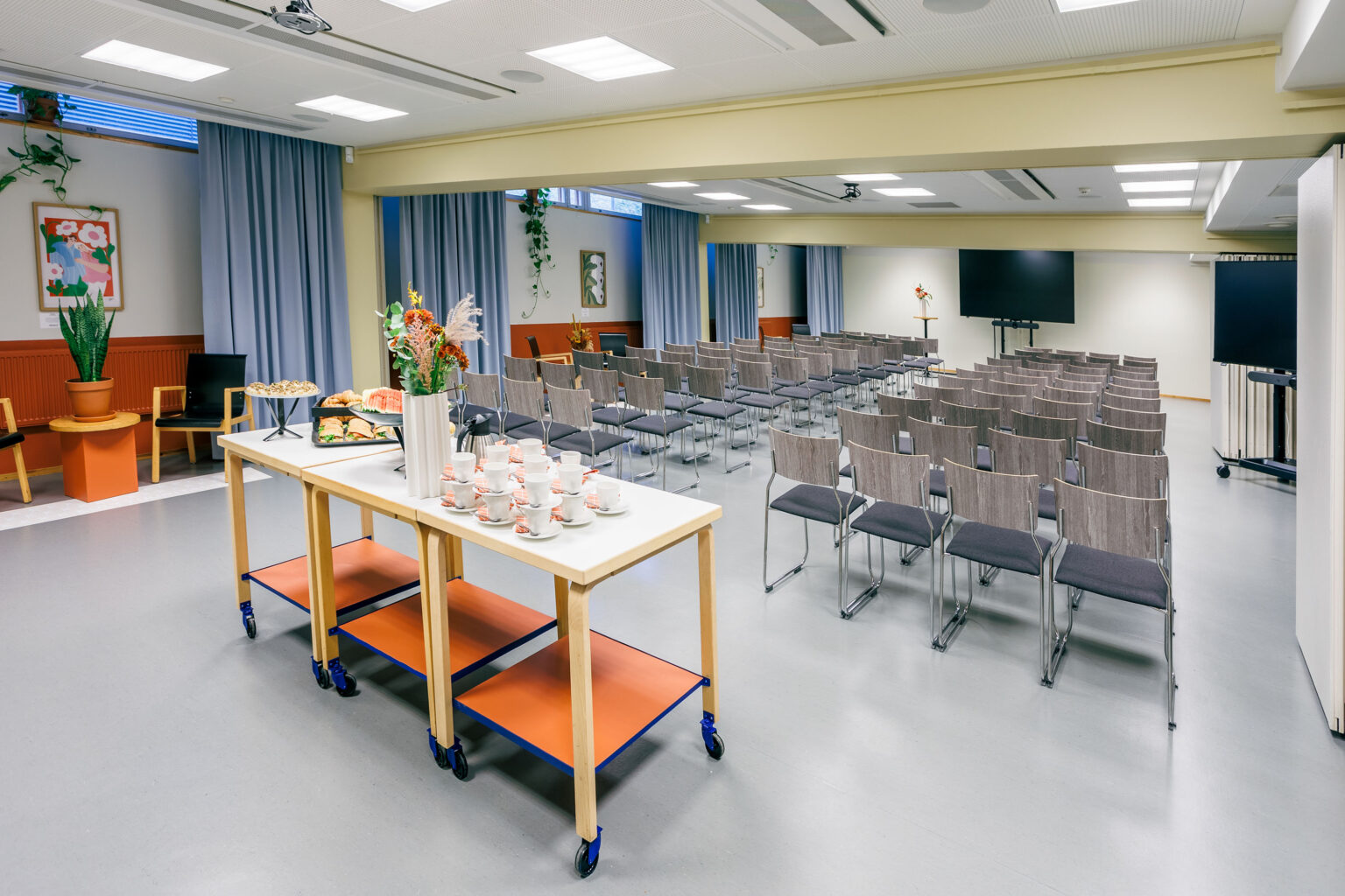 - Moderni kokous- esitys- ja tapahtumatekniikka: liikuteltavat näytöt, helppokäyttöiset liitännät, hybridikokousvalmius, laadukas äänentoisto ja nopea wifi luovat erinomaiset puitteet tilaisuuksiin.