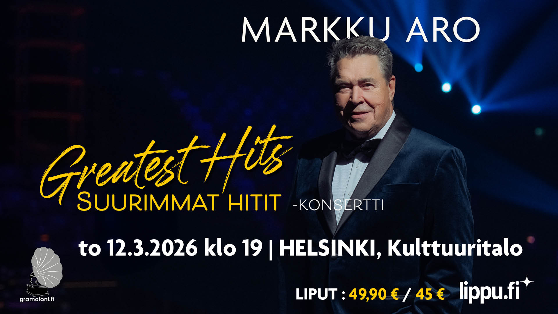 Legendojen legenda Markku Aro on koko kansan tuntema, suorastaan ikoninen taiteilija iskelmämusiikin saralla. Aroa kuvaillaan oikeutetusti alansa rautaiseksi ammattilaiseksi ja samalla kiistatta yhdeksi Suomen suosituimmista iskelmätähdistä. Uskomatonta, mutta totta on se, että Markku teki ensimmäisen oman konserttikiertueensa vasta vuonna 2019 – oman 70-vuotissyntymäpäivänsä kunniaksi. Vuonna 2026 on luvassa uran toinen kiertue, joka kantaa nimeä MARKKU ARO – Greatest Hits – Suurimmat hitit.